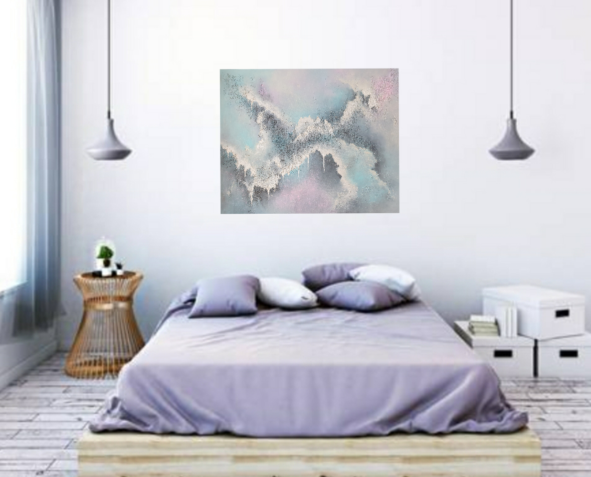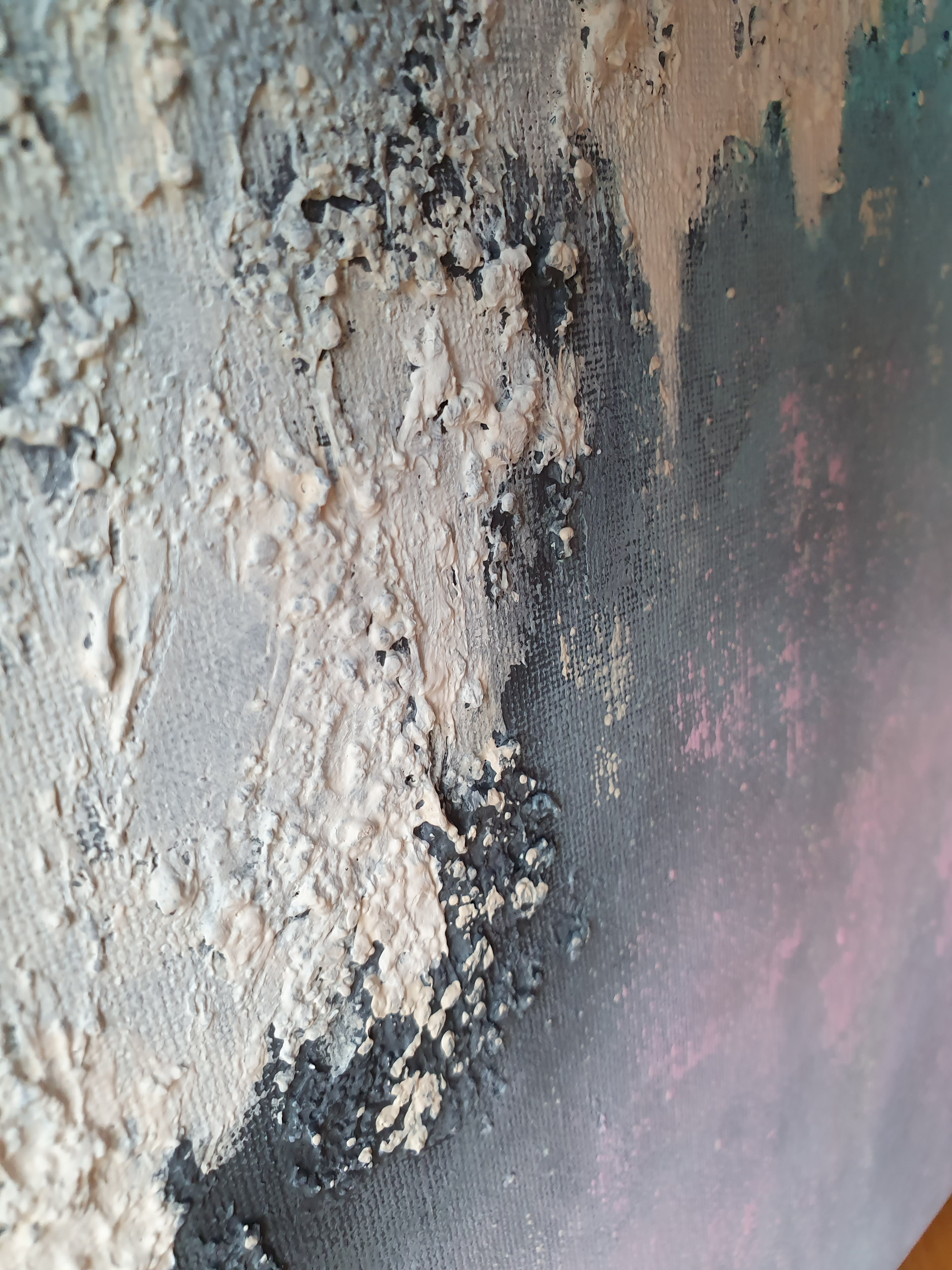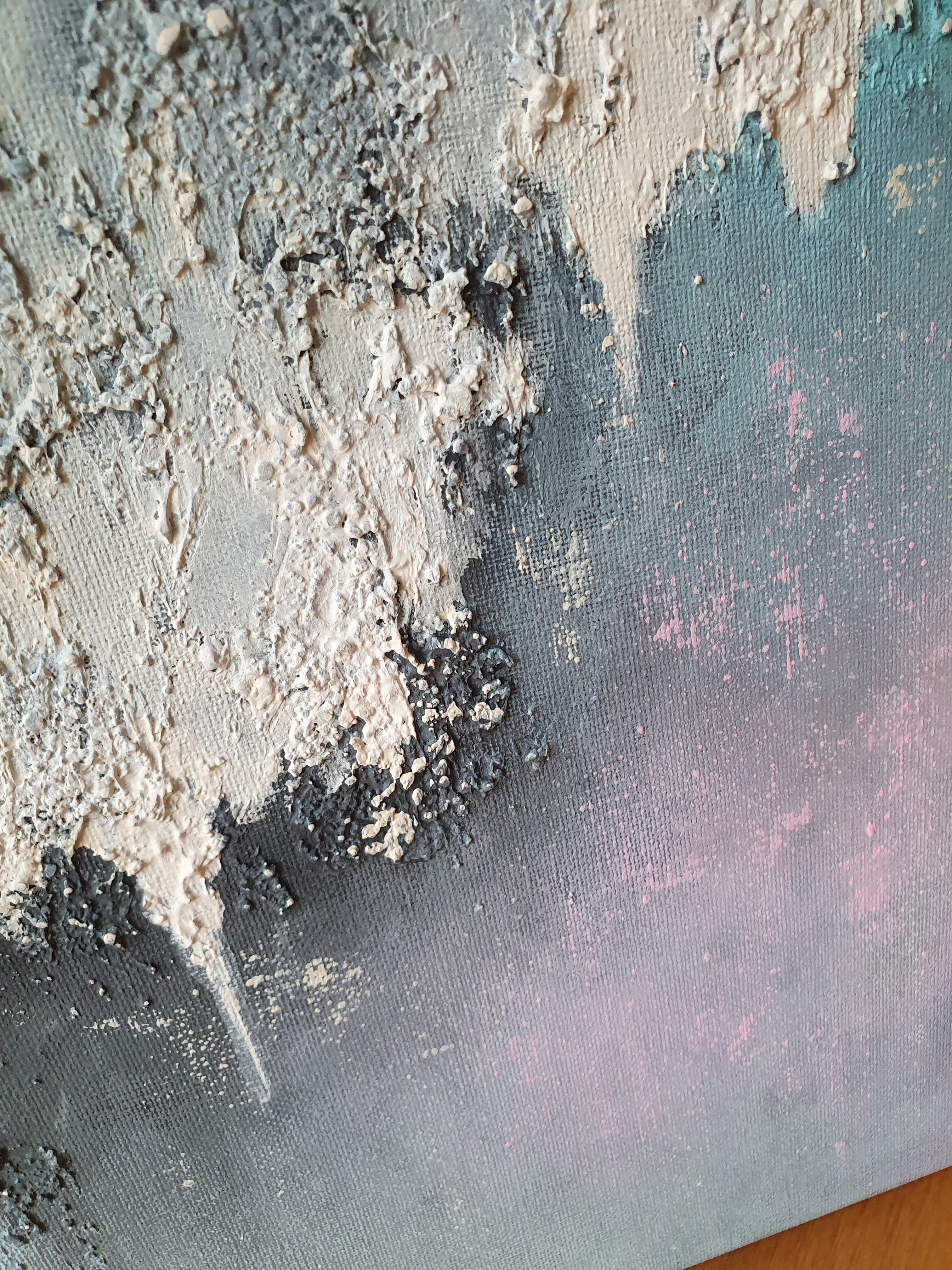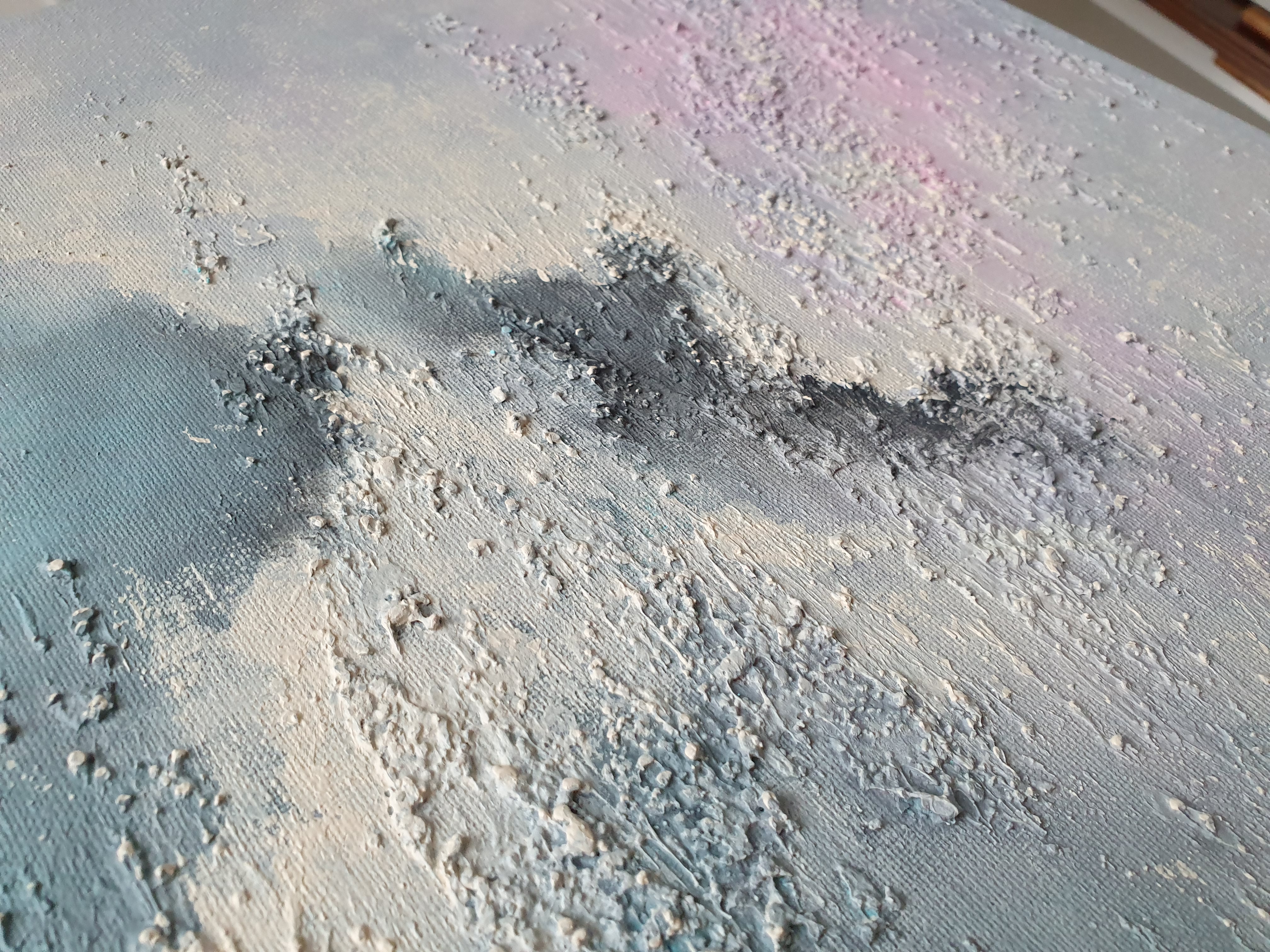 Tento obraz je inspirovaný zimní pohádkou během našeho prázdninového pobytu. Představte si, že se díváte do údolí, kde se válí mlha a jste na kopci, kde nádherně svítí slunce, Chytnete si první stopu a s větrem o závod na prázdné sjezdovce pádíte dolů. Nikdo kolem vás není. Brzké krásné mrazivé ráno na horách.