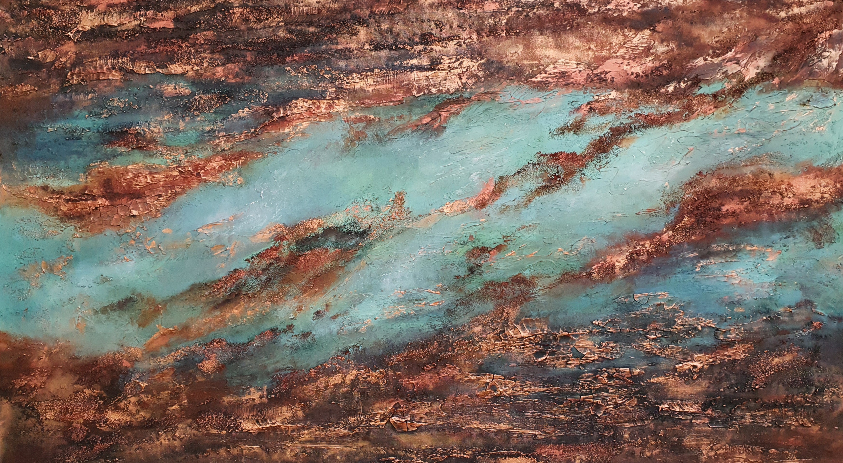 You are completely absorbed in the activity you are doing, the energy passes through you, you lose track of time, creation goes by itself. This is exactly the feeling I had when I painted the painting. This color combination is amazing and I really like it. Green and blue soothe, represent peace and quiet, gold color represents unlimited possibilities in our lives.