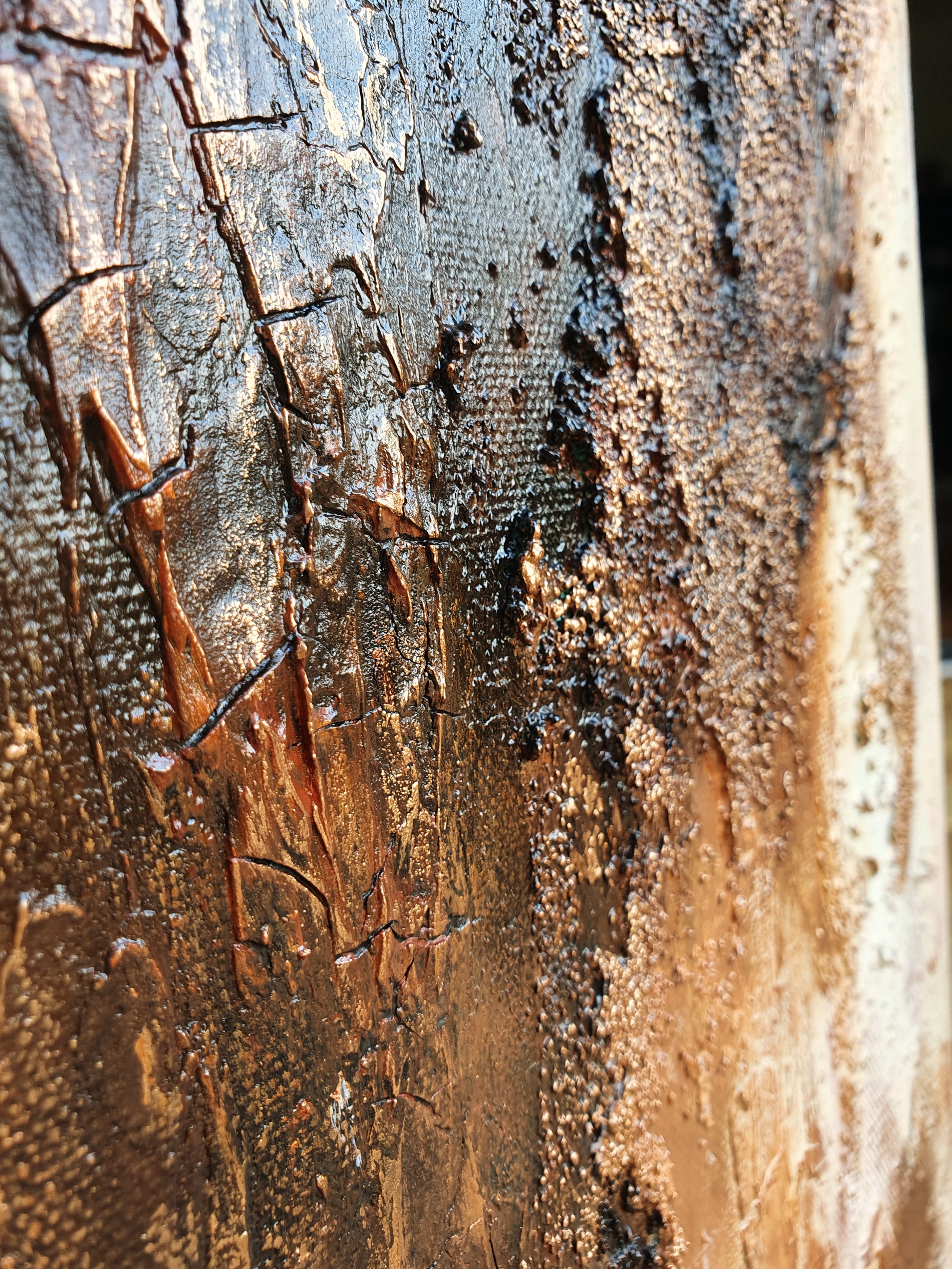 Heavy texture is on the picture. Combining cream and sienna colors shadows together with gold creates a beautiful 3D effect.
