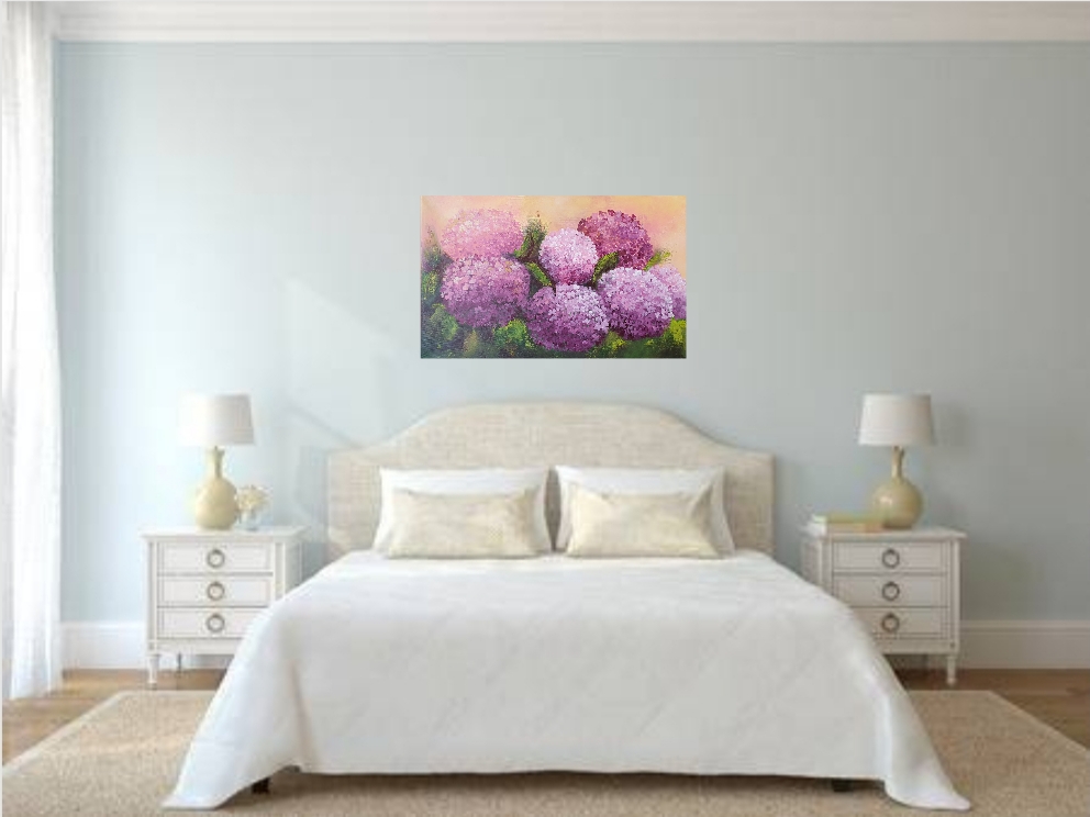 Tento obraz je inspirovaný létem, letními zářivými barvami a sluncem. Hortenzie jsou v létě mé nejoblíbenejší. Mají neuvěřitelné množství odstínů a barev. Řekla bych, že je to „Její Výsost“ mezi květinami 🙂